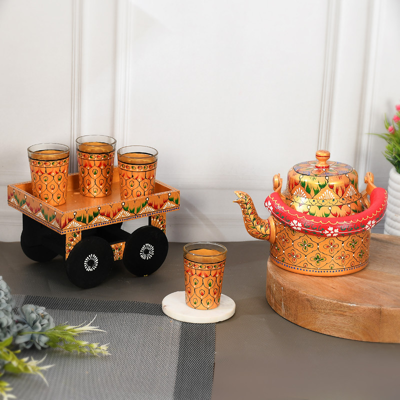 HandPainted Alluminium Tea Kettle with Four Glasses and Wooden Tray For Home Decor , Tea Party , Serving